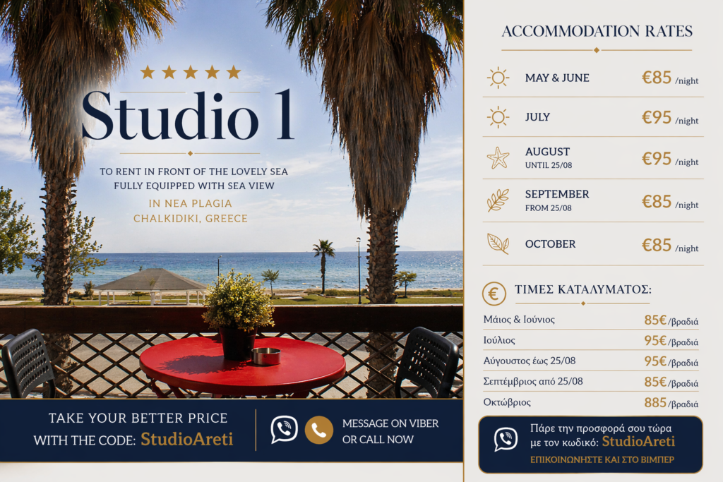 Enjoy your stay in a wonderful studio overlooking the sea, ideal for relaxation and comfort. The accommodation is located in Nea Plagia Chalkidiki Greece, offering a unique experience of views and direct access to the sea.