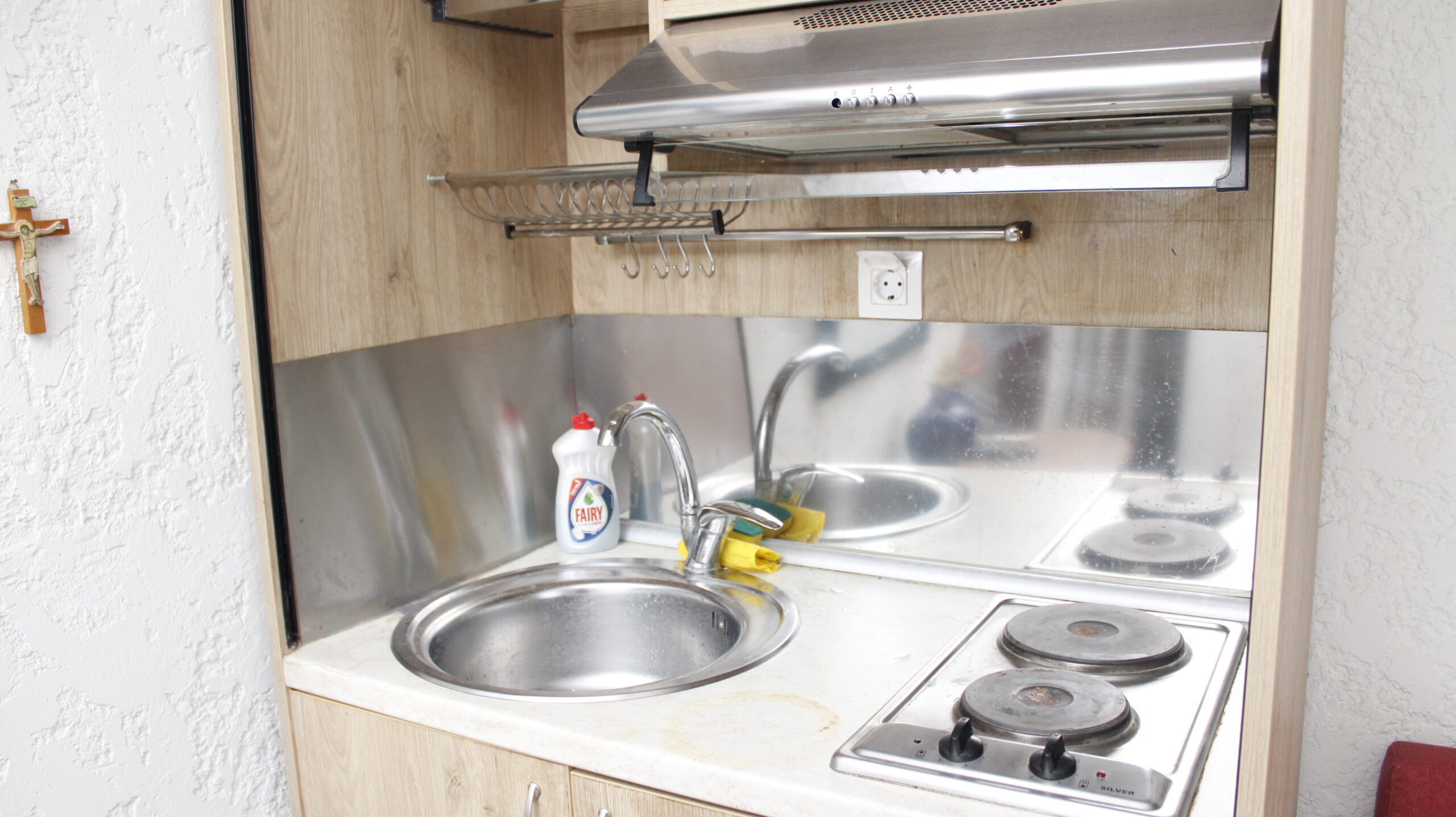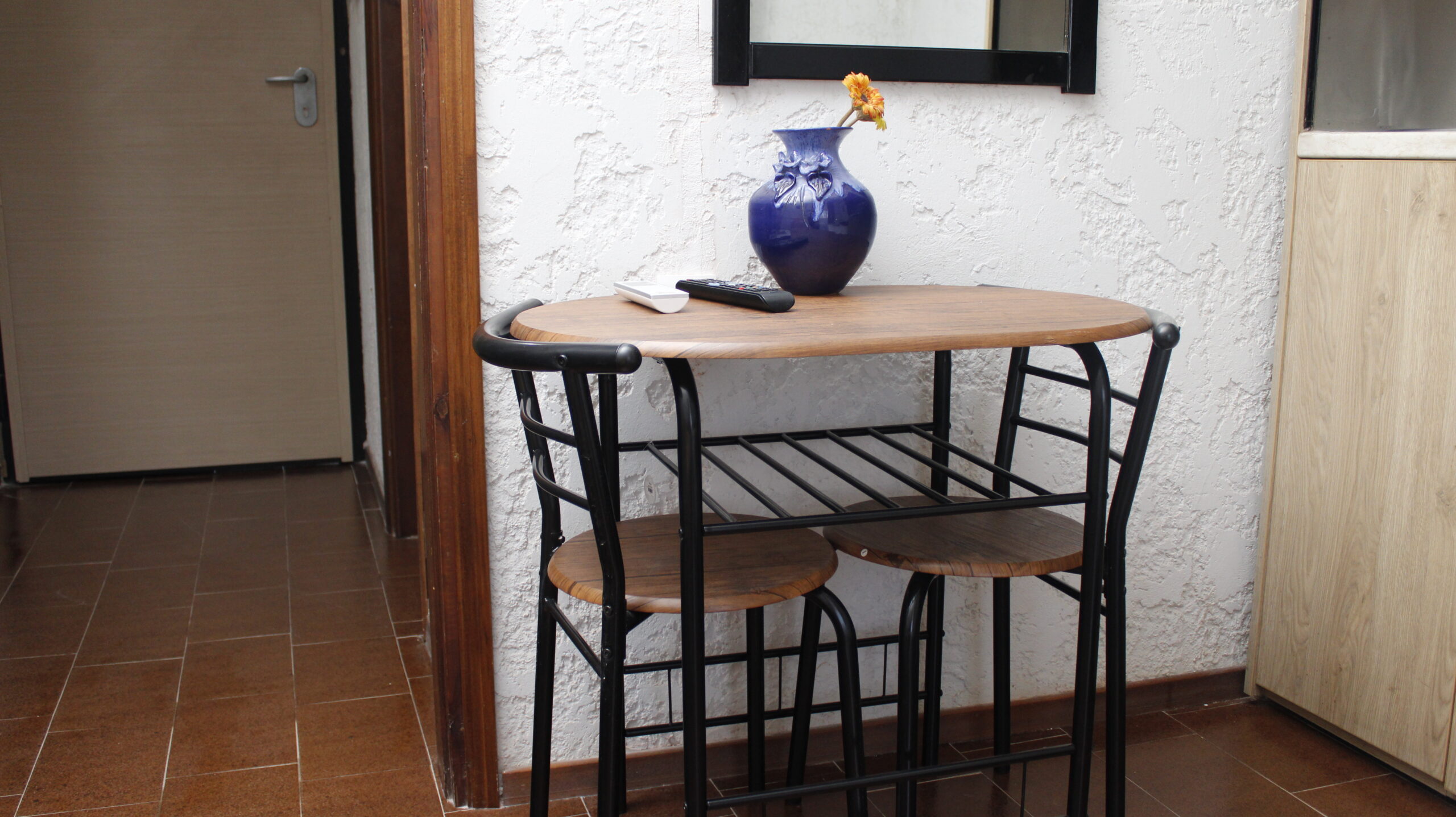- Fully equipped kitchenette with a coffee maker, toaster, cooking hobs, kitchenware, and a dining table.