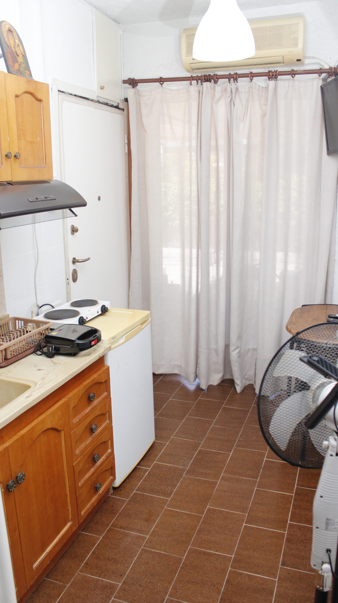 - Ανεμιστήρας δαπέδου και οροφής, σιδερώστρα με σίδερο και απλώστρα.